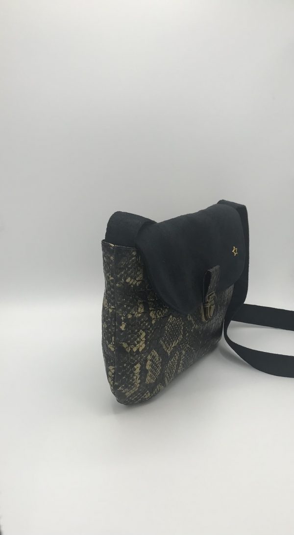 Modèle : Simili cuir aspect serpent noir et or et rabat en suédine noire