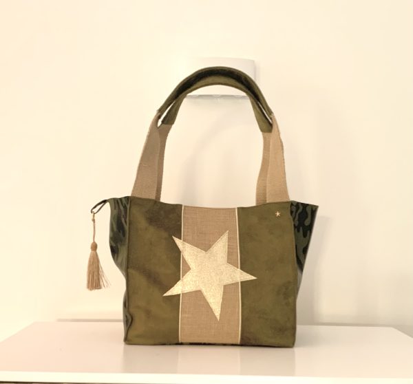 Modèle : Sac cabas Stella en suédine kaki, toile de jute, cuir vegan, étoile pailletée doré